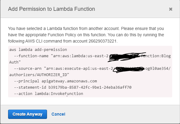 aws lambda add-permission --function-name "arn:aws:lambda:us-east-2:<first_account_number>:function:BlogAuth" --source-arn "arn:aws:execute-api:us-east-2:<second_account_number>:og9l0ae354/authorizers/nzocpg" --principal apigateway.amazonaws.com --statement-id xxxxxxxxxxxxxxxxxx --action lambda:InvokeFunction